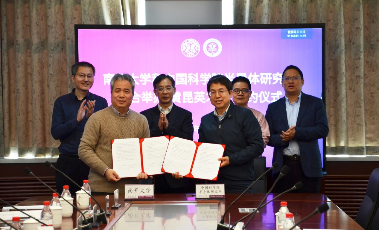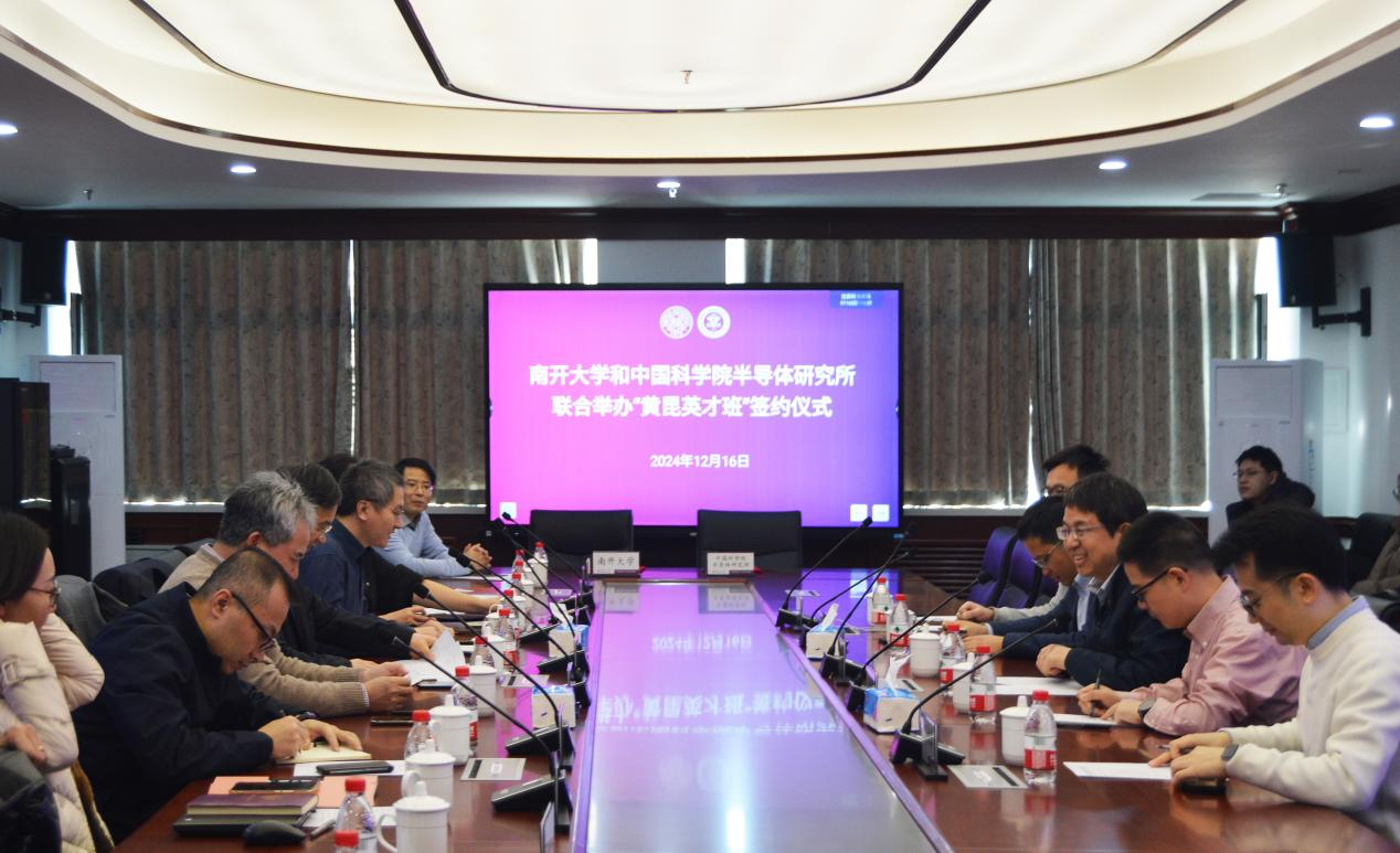 为进一步贯彻落实党中央关于统筹推进教育科技人才体制机制一体改革的重大决策部署,以及中国科学院关于科教结合联合培养本科生行动计划精神,实现与高等院校的优势互补,加快创新拔尖人才培养的工作要求,12月16日上午,南开大学和中国科学院半导体研究所在南开大学伯苓楼会议室联合举办“黄昆英才班”签约仪式。中国科学院半导体研究所所长谭平恒、南开大学党委常委、副校长方勇纯出席仪式,南开大学物理科学学院党委书记唐柏权、院长张国权等领导班子成员、教师与学生代表,以及半导体所研究员魏钟鸣、邓惠雄、吴江滨、史衍猛等参加签约仪式,会议由唐柏权主持。
