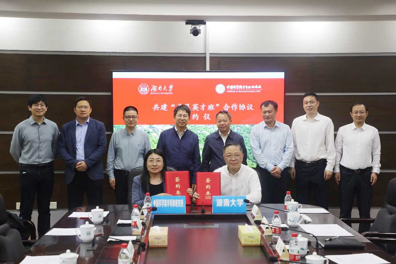 徐艳坤、许和连作为双方代表正式签署联合创办“黄昆英才班”协议。根据协议,“黄昆英才班”将在湖南大学半导体学院(集成电路学院)相关专业的优秀本科生中进行选拔,通过整合高校和中国科学院研究院所的优质资源,科教融合、协同育人,培养具有扎实的半导体物理基础、熟练掌握半导体器件制备技术、对集成电路应用感兴趣、热爱科学研究、有志于成为半导体及相关领域经世致用领军人才的优秀本科生。此外,半导体所还设立了“黄昆奖学金”,奖励在“黄昆英才班”中表现优异的学生。
