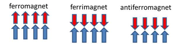 图1. 铁磁(ferromagnet)、亚铁磁(ferrimagnet)和反铁磁(antiferromagnet)的磁晶格示意图。
