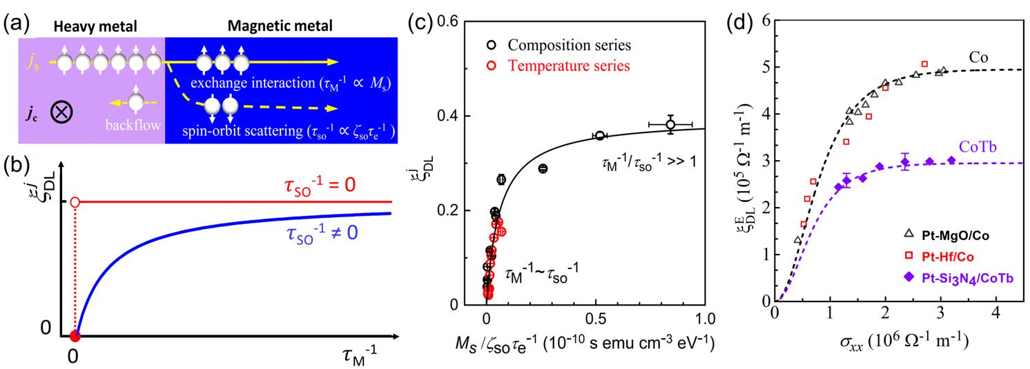 自旋电子器件是解决后摩尔时代信息科学“存储墙”等瓶颈的重要选项。作为新原理器件,自旋电子器件如何通过新材料和新原理快速突破性能极限成为当务之急。近年来,亚铁磁和共线反铁磁等反铁磁耦合材料因其超快自旋动力学(~THz)和低退磁场特性成为自旋电子学领域的明星材料,人们暗自期待采用亚铁磁和反铁磁材料发展出优于铁磁的自旋存储器。然而,反铁磁耦合材料究竟如何与自旋流相互作用、能否作为低势垒信息存储介质、能否实现高效自旋调控等基本科学问题仍缺乏定论。另一方面,研究人员已经普遍认为自旋调控是自旋电子器件实用化的必由之路,而最具吸引力的自旋调控方式为自旋轨道矩(Spin-orbit torque)。自2011年被实验发现以来,自旋轨道矩被认为是一种“界面”角动量转移效应,即自旋流将角动量从电子或磁振子等载流子通过交换耦合转移给磁性材料界面,并以几乎“无穷大”速率弛豫的物理效应。因此,自旋轨道矩效应被认为与磁性材料内部的性质无关,即无论磁性材料导电性、自旋轨道耦合强弱、饱和磁矩大小、甚至厚度等无关。这种情况下,对于自旋霍尔金属/磁性材料体系,自旋轨道矩效率(
