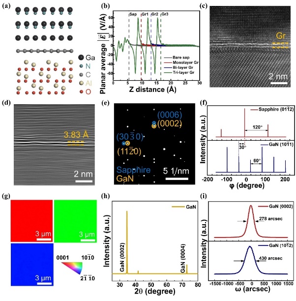 研究团队首先应用DFT计算预测了氮化物在石墨烯覆盖的单晶衬底上的生长行为。发现除“晶格透明”外,石墨烯还具有传递衬底势场的能力,并通过石墨烯缺乏面内和面外偶极矩的特性与π电子重新分布过程解释了这一现象。由此确认了在石墨烯覆盖的单晶衬底上氮化物生长实质上仍受到衬底晶格的调控,其机制为“远程外延”,而石墨烯则为“远程外延”的理想缓冲层。研究团队在石墨烯覆盖的蓝宝石衬底上进行了氮化物外延生长,其与异质外延相一致的外延关系佐证了上述观点(图1)。