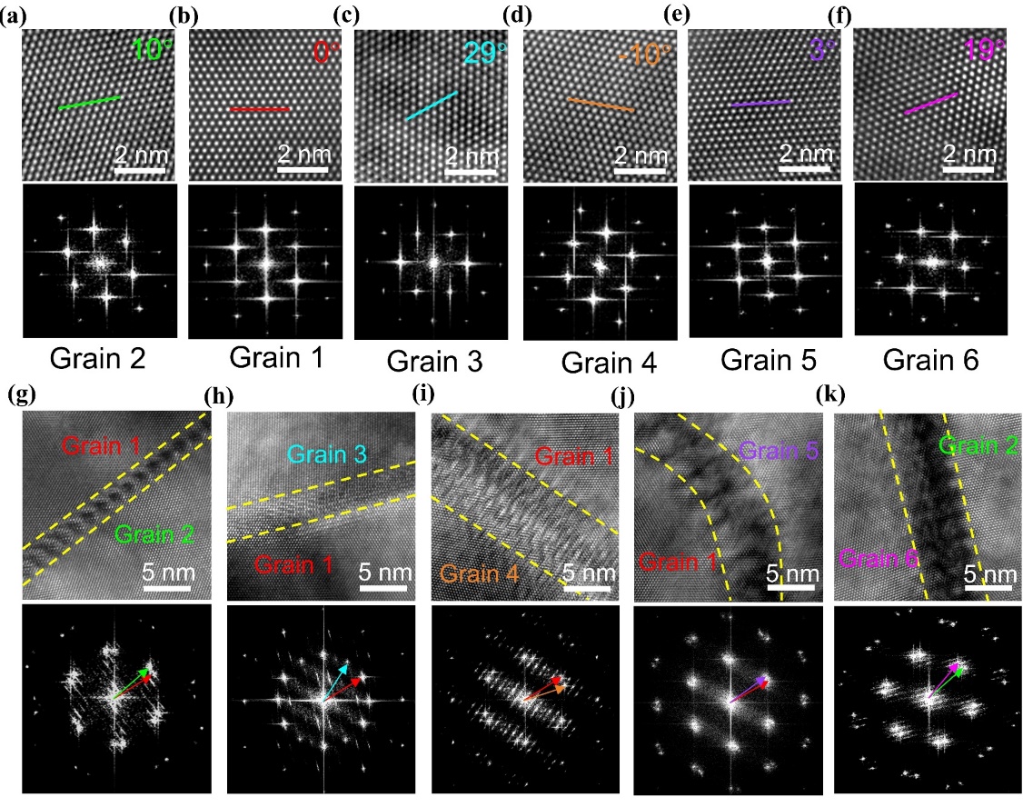 图2. 石墨烯-石英玻璃晶圆上多种取向并存的氮化物外延层