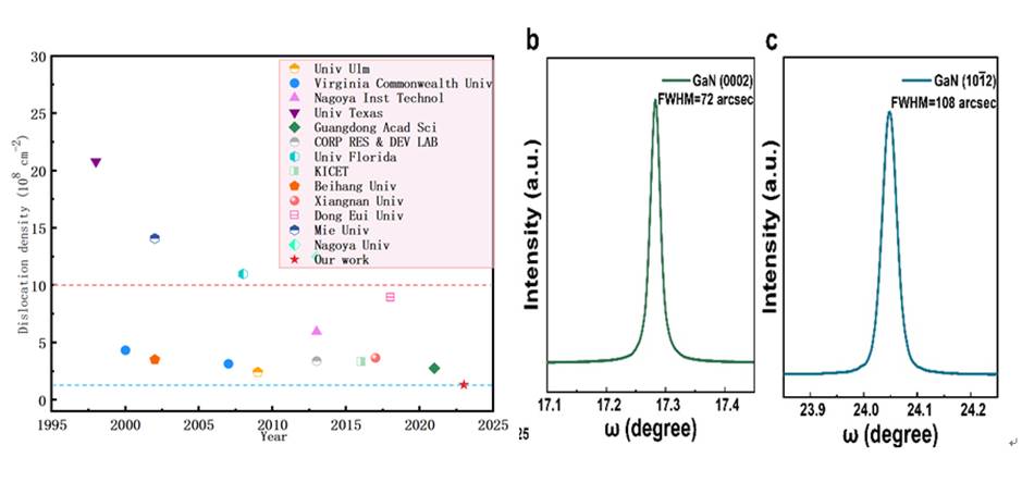 基于对氮化物生长界面方面较深入的研究,研究团队在高质量氮化物外延生长方面取得进展,蓝宝石衬底氮化镓外延材料位错密度降低至1.1×108 cm-2, 优于文献报道的实验结果(图5)。