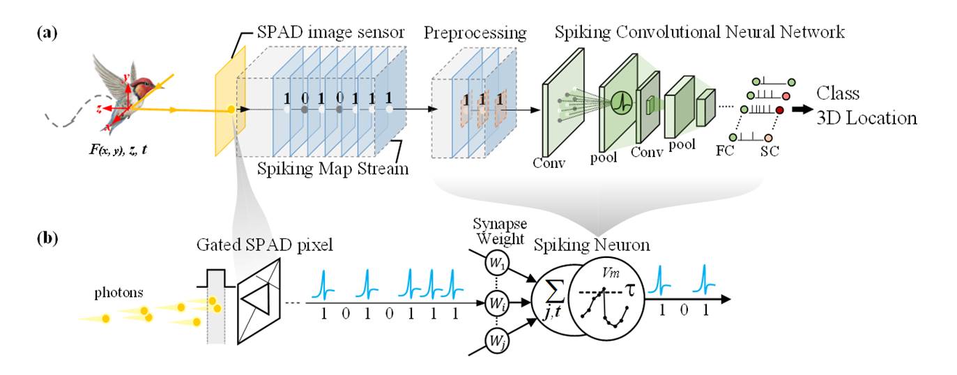 中国科学院半导体研究所刘力源研究员带领团队在脉冲型人工视觉芯片设计领域取得重要进展。团队创新性地设计了一款脉冲型人工视觉芯片,它集成了单光子脉冲型图像传感器和可重构脉冲视觉处理器,可实现视觉信息的获取、表达、处理和传输等全链路的信息脉冲化,更加接近了人类的视觉系统,为突破现有人工视觉芯片的瓶颈提供了一种新思路。芯片采用单光子雪崩二极管像素(SPAD)天然地生成高速脉冲型图像信号,并采用神经形态脉冲计算范式直接处理单光子脉冲视觉信号,构建了一个如图1所示的低复杂度、低延迟的脉冲视觉信号流处理系统。脉冲型人工视觉芯片可实现二维灰度成像和三维深度成像,并灵活地重构为脉冲图像信号理器(ISP)或脉冲神经网络处理器,实现二维三维视觉融合智能化处理;同时,通过实时智能图像处理判断不同成像场景,可以反馈控制图像传感器的配置参数,提升成像质量。测试结果表明,最高成像速率为每秒10万脉冲图像帧,动态范围高达100dB,具有二维三维融合的目标识别定位和光照自适应功能。图2和图3分别为芯片照片和测试结果。该项研究为体积和供电均受限的边缘视觉设备提供了实现低延迟多模视觉感算一体化高集成度片上系统芯片的新方法。