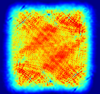 (左)二维固体激光阵列图片;(中)二维固体激光阵列近场光束图像;