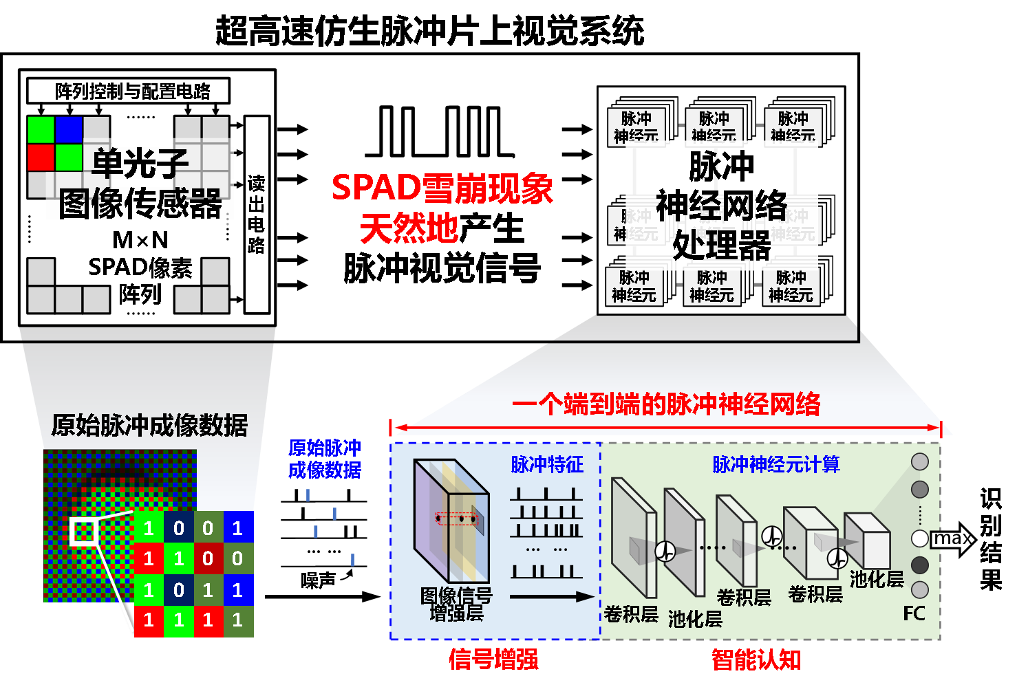 中国科学院半导体研究所刘力源研究员带领团队在超高速仿生片上视觉系统电路设计领域取得重要进展。团队创新性地设计了一款集成了单光子脉冲型图像传感器和脉冲神经网络处理器的超高速仿生脉冲片上视觉系统(图1),单光子雪崩二极管像素(SPAD)阵列天然地生成高速脉冲型图像信号,端到端的脉冲神经网络完成图像信号增强和智能图像识别任务,成功地实现了仿人类视觉系统的全脉冲型图像获取、传输、处理的功能。