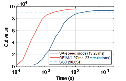 图2 光电伊辛机(红线)与模拟退火算法(蓝线)求解I4096最大割问题的割值
