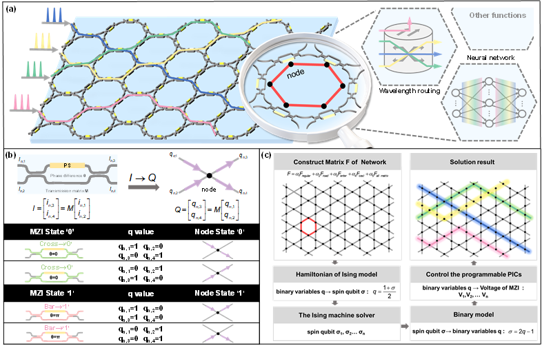 图1:可编程PICs等效伊辛模型。(a)可编程PICs结构示意图;(b)单元结构MZI的等效伊辛模型;(c)伊辛智能计算求解过程。