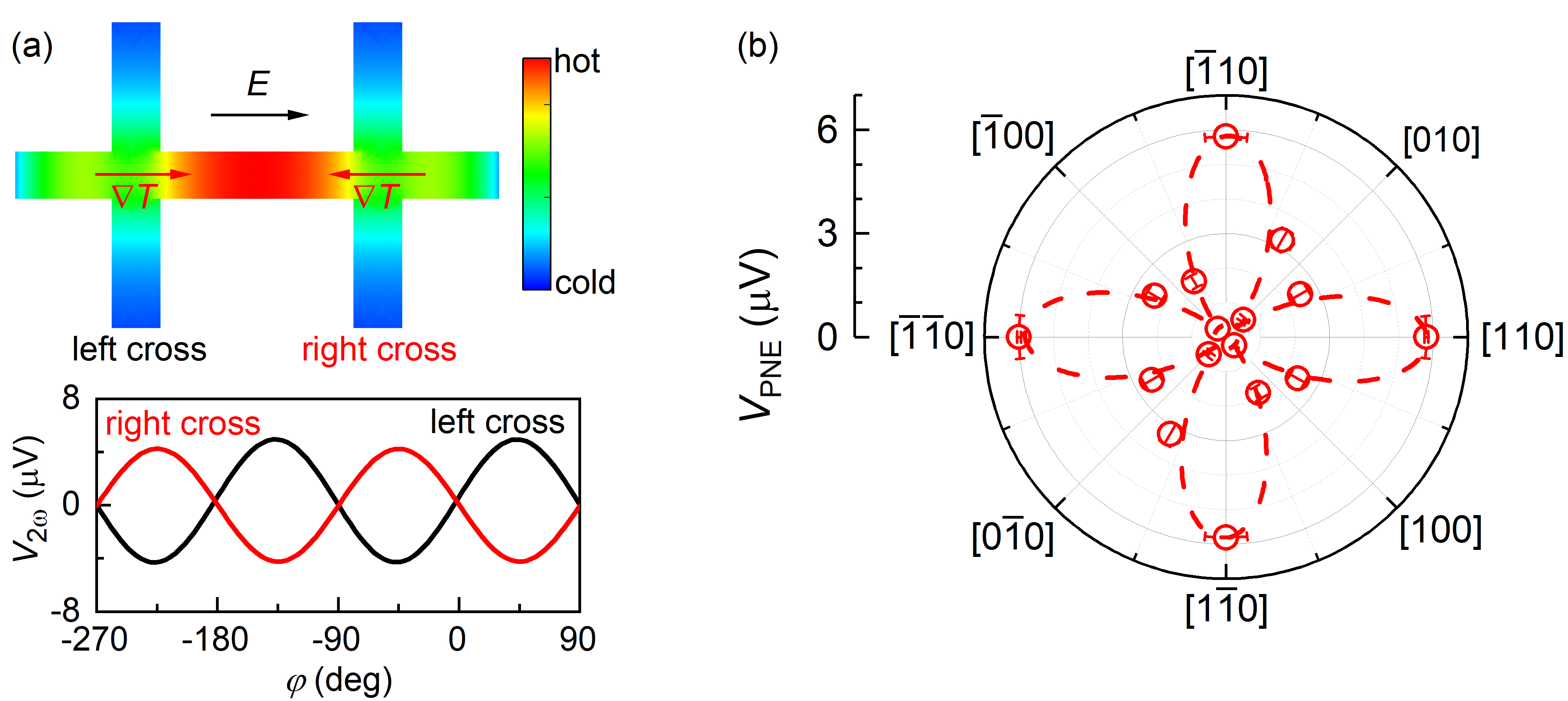 图1. (a)双十字霍尔器件中的平面能斯特效应;(b)CoFe (001)平面能斯特电压的各向异性。