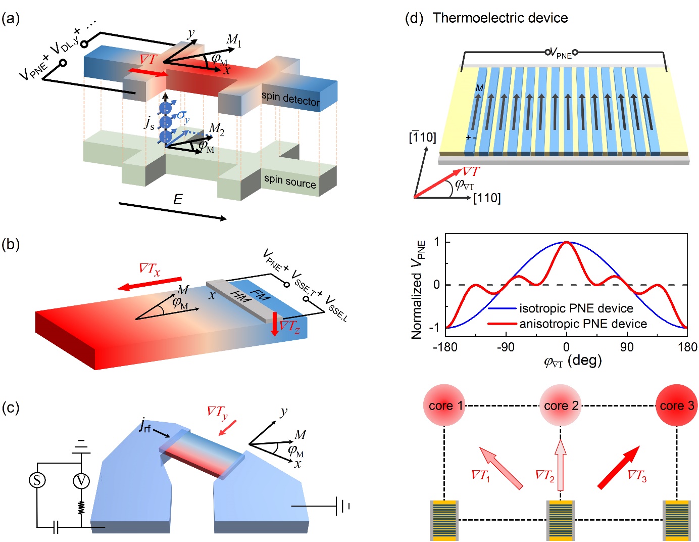 图2. 各向异性平面能斯特效应对(a)谐波霍尔电压、(b)自旋塞贝克、(c)自旋扭矩-铁磁共振等自旋电子实验的广泛影响及其在(d)热电器件方面的应用案例。