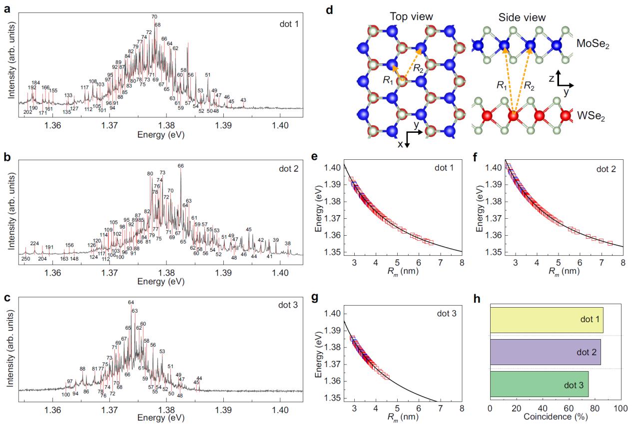 图1,DAP IX?荧光光谱。(a-c) IX PL光谱。(d)?范德华异质结中的DAP IX示意图。(e-g)?理论计算的DAP IX峰位和实验结果比较。(h) DAP模型的拟合度。?