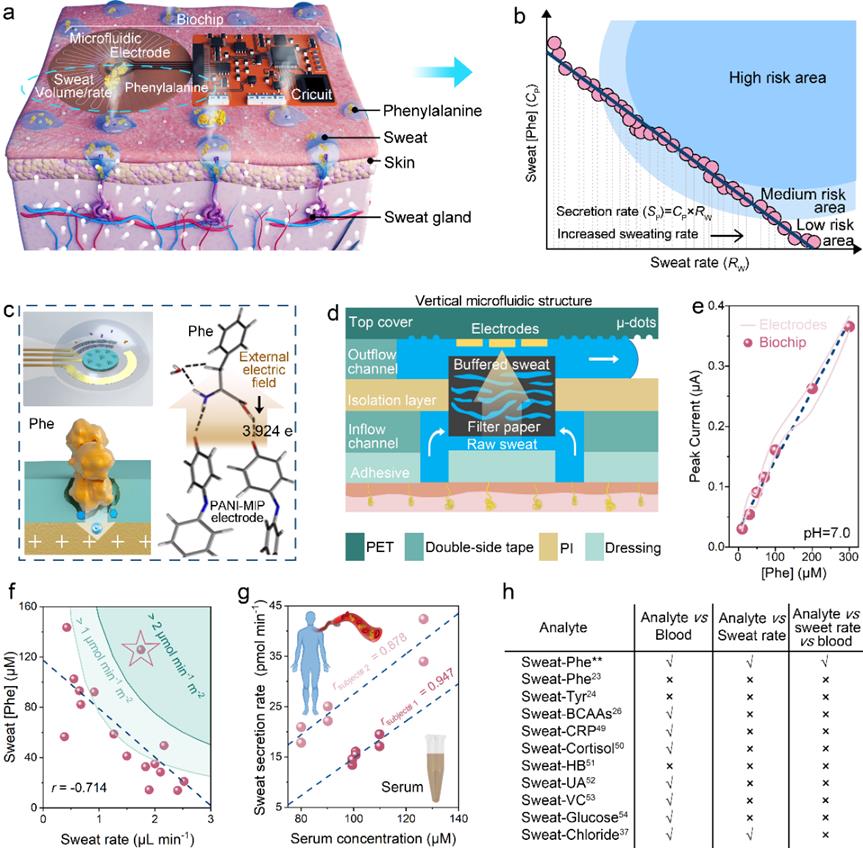 汗液作为最容易获得的体液之一,其中富含有大量与健康相关的生物标记物可用于无创监测,近年来受到了可穿戴健康电子领域的极大关注。苯丙氨酸作为人体的八大必需氨基酸之一,大量存在于人体组织和体液中,对个体的智力发育、健康维持、免疫反应等方面十分重要。但是,由于缺乏合适的高灵敏度检测方式以及可靠的汗液-血液苯丙氨酸水平相关性研究依据,汗液中的苯丙氨酸很少被可穿戴汗液生物传感技术探索开发作为生物标记物用于健康监测。