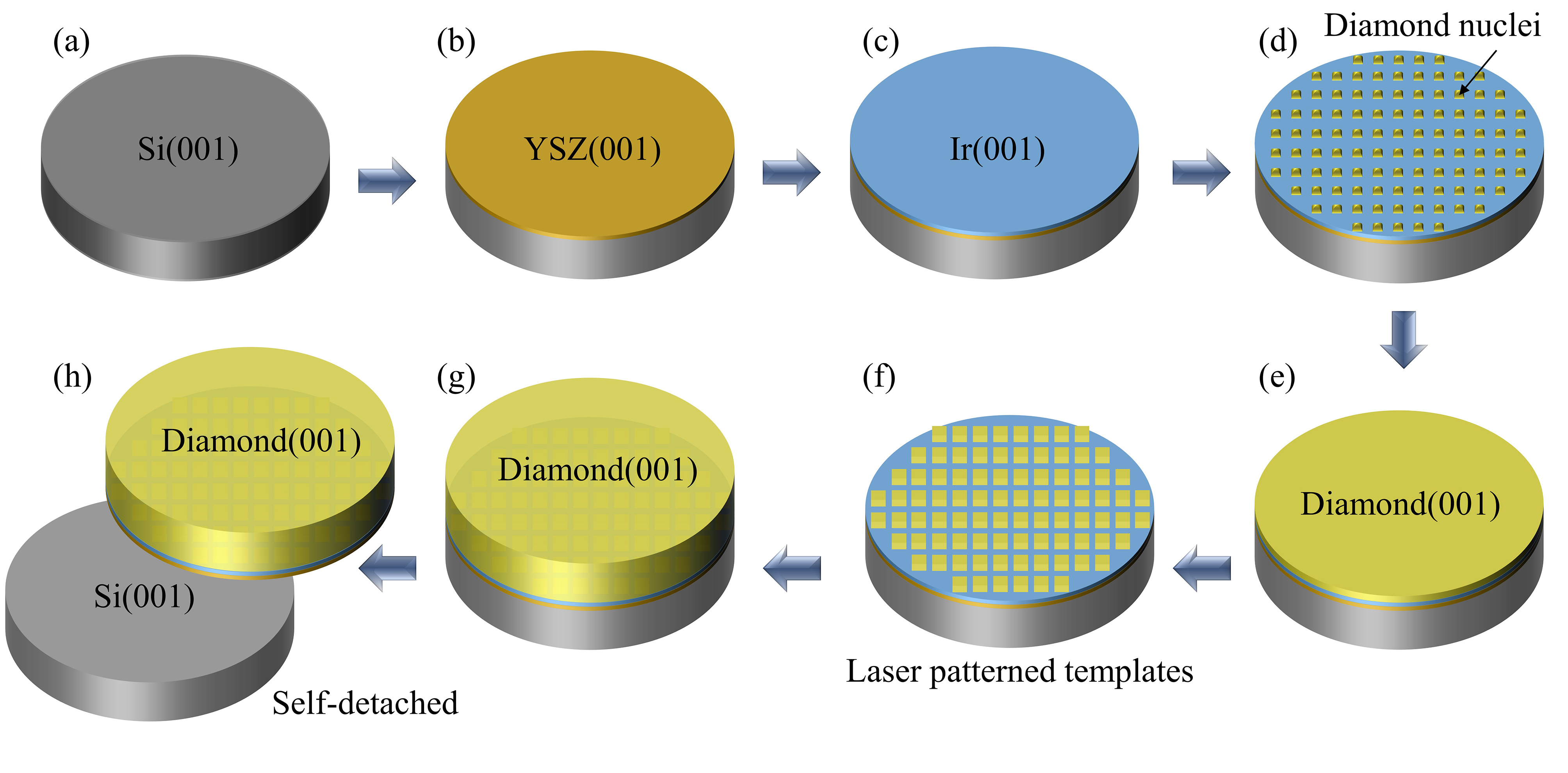 中国科学院半导体研究所金鹏团队在金刚石生长中取得重要进展,采用激光切割图案化工艺缓解金刚石层异质外延生长过程中的巨大应力,在Ir/YSZ/Si复合衬底上实现了2英寸异质外延自支撑金刚石单晶的制备。结果表明激光图案化方法可以在大尺寸金刚石生长过程中有效释放应力,为传统光刻图案化方案提供了一种更简单、更经济的替代方案。