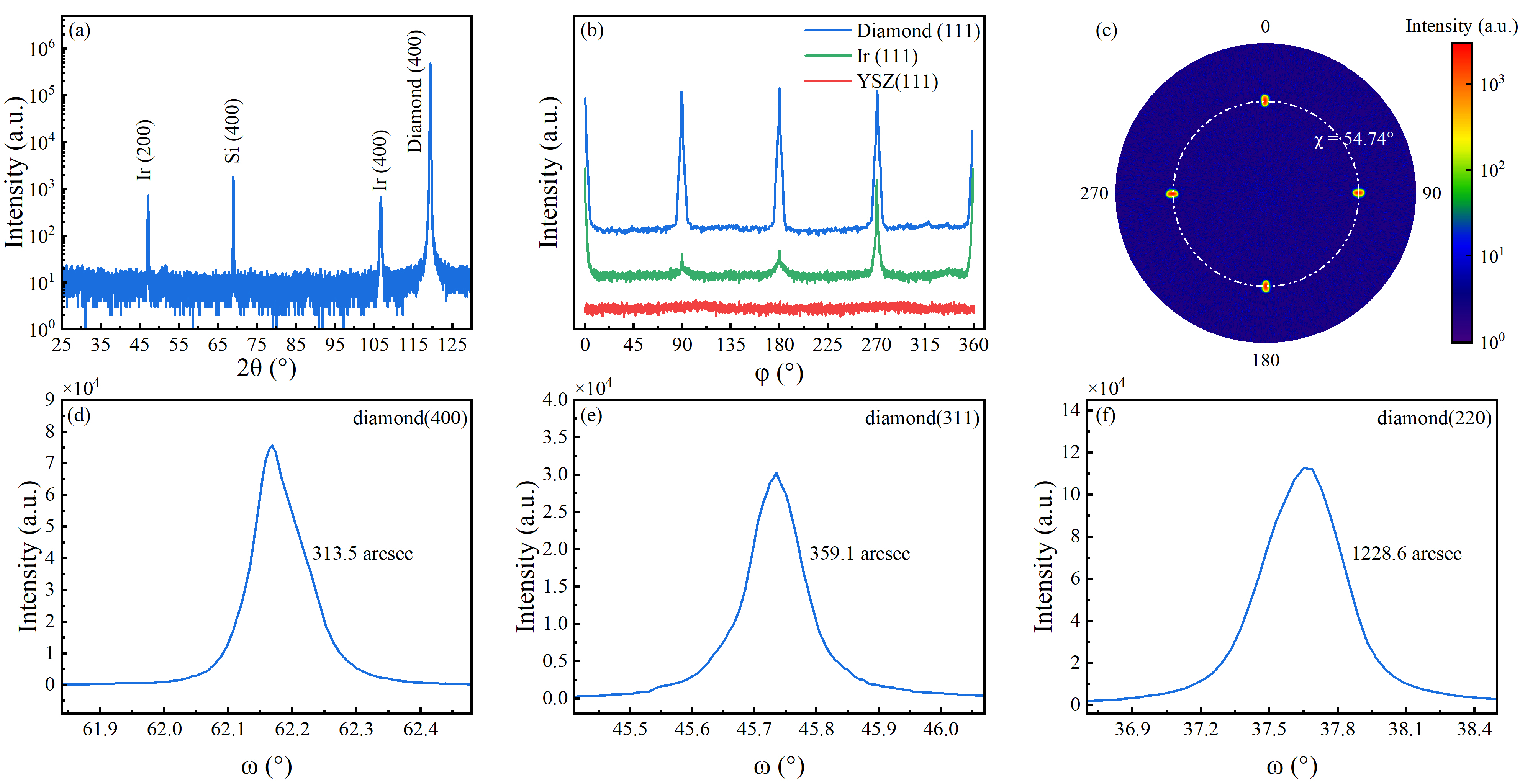 图2. (a) Ir/YSZ/Si (001) 上异质外延金刚石的 θ-2θ 扫描 X 射线衍射图; (b) 金刚石(111)和Ir(111)在极角χ=54.74°下的面内φ扫描; (c) 金刚石{111}衍射峰的X射线极图;(d)?金刚石 (200)、(e) (311)和(f) (220)的摇摆曲线。