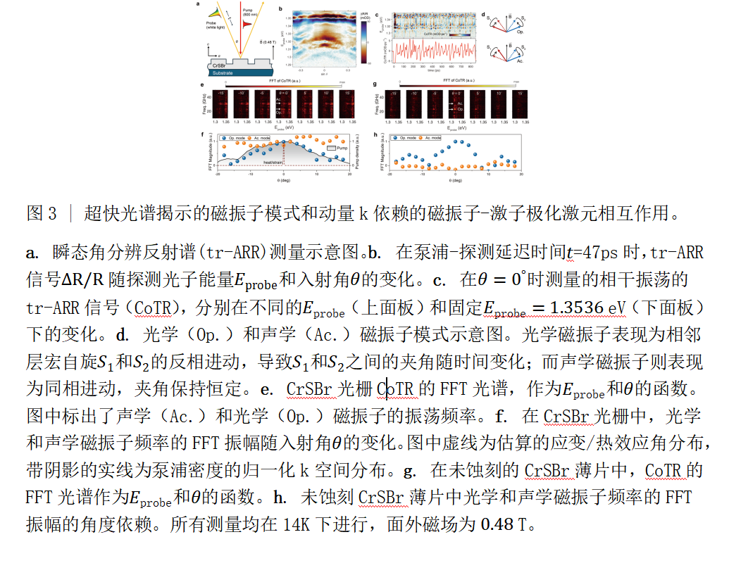 近期,中国科学院半导体研究所半导体芯片物理与技术全国重点实验室王开友研究员、黄雨青研究员及其合作者报道了基于二维磁性半导体CrSBr一维超表面的磁振子-光子界面(图1a),该CrSBr超表面中承载的连续体内的束缚态(BICs)与激子发生强耦合,形成激子极化激元(EP),其能量和辐射特性都可以通过外部磁场进行调控(图2)。进一步通过瞬态角分辨反射光谱测量,研究发现相干光学磁振子能够对激子极化激元的能量进行超快调控,且引入了非平凡的动量依赖性,反映了自旋、磁振子与光子之间的协同耦合行为。相比之下,声学磁振子仅表现为局域化调制信号,未体现出动量相关的相干耦合特征(图3)。理论分析表明,这种磁振子模式选择性来源于CrSBr层间反铁磁结构中不同磁振子的对称性差异。